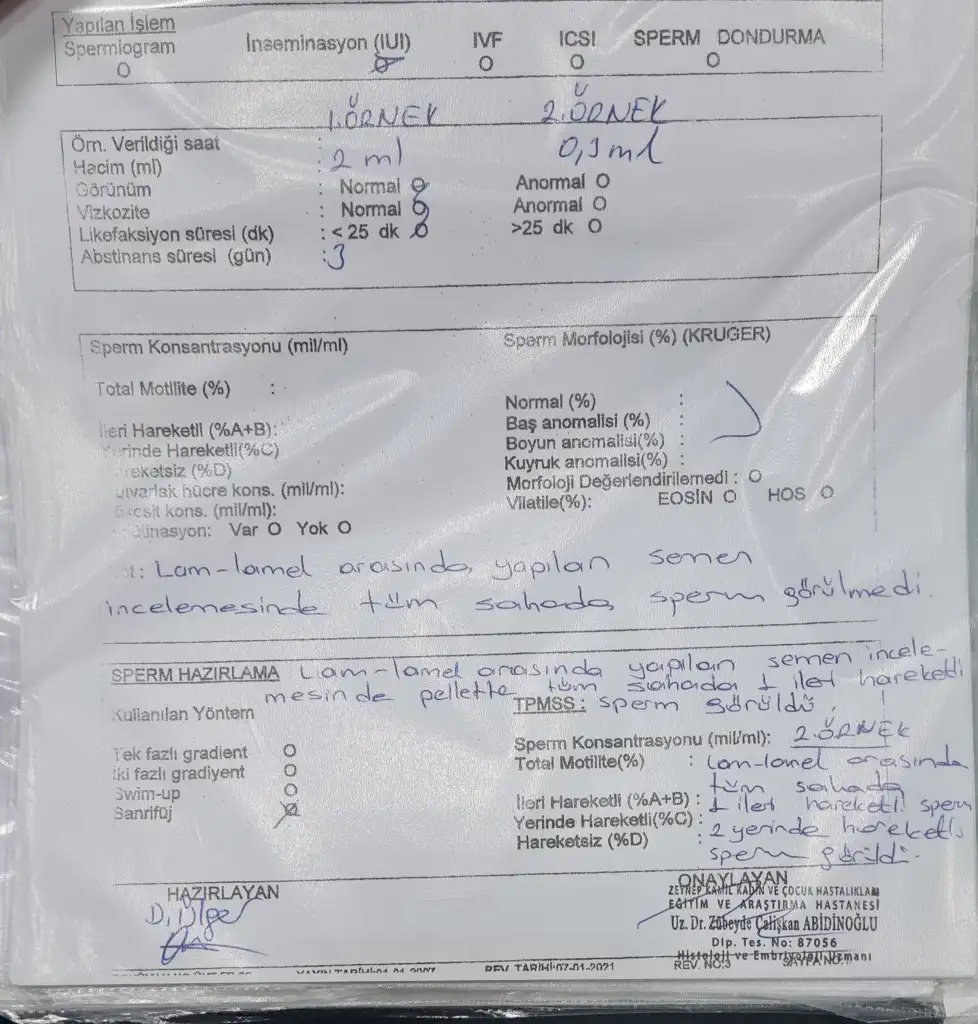 bende hiç sperm yok zannettim. meğerse sperm sayısı çok az olduğu için hiç incelememişler bile.