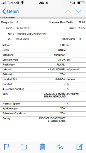 Merhaba sizin sonuçların yazımı benimkisinden farklı biraz ileri hareket konusunda sanırım çok az sıkıntı var ama bizimkisinin yanında çok çok iyi eşimin %5 ti ne zaman gösterecek doktora başka sorun yoksa ileri hareket için takviye gıda ve kürlerle çok kolay yükselir bence sizinkiArkadaşlar rica etsem bunuda yorumlarmısınız...