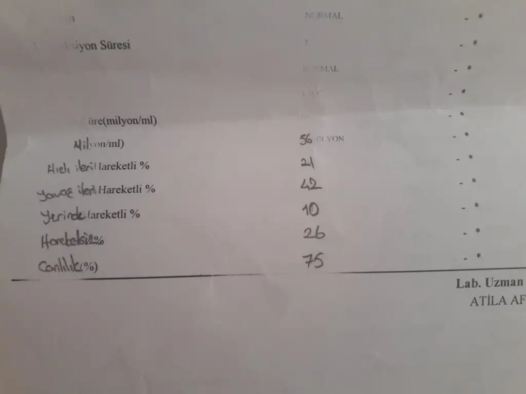 Canımm şimdi eski mesajlara bakıyordum da eşinizin değerleri bence iyi ya siz isteyeli kaç ay oldu.buda 2. silik ciktifi icin sayilari ben yazdim e nabizdan bakarak ustlere gerek duymadim. burdaki labaratuarda sadece bu degerlere bakiliyor