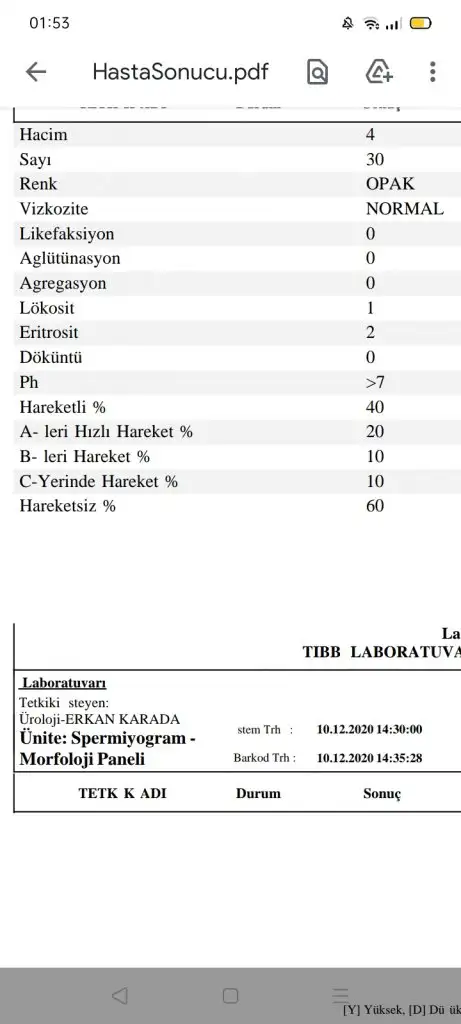 Maalesef bende bu tür tıbbi terimlerle yeni karşılaşanlardanım. Bir yıllık evliyim hamile kalmayınca doktora gittim. Doktor Bende bir problem olmadığını söyleyince eşim semen testi yaptırdı. Sonuçlar kötü çıktı. Morfoloji bozukluğu var %100 bozuk. Sperm sayısı 2.000.000 . Normalde en az 15.000.000 olması gerekli. Bide varikosel var. Varikosel in değerleri olumsuz etkilemiş olabileceğini söyledi doktor. Ultrason çekildi eşim sonuçları bekliyoruz. Enfeksiyon varmış bide . Bakalım bekliyoruz.2017de acilan bi konuyu okurken biraz etkilendim genelde problemler ayni herkes kendi derdine care arayip birbirine moral vermis.