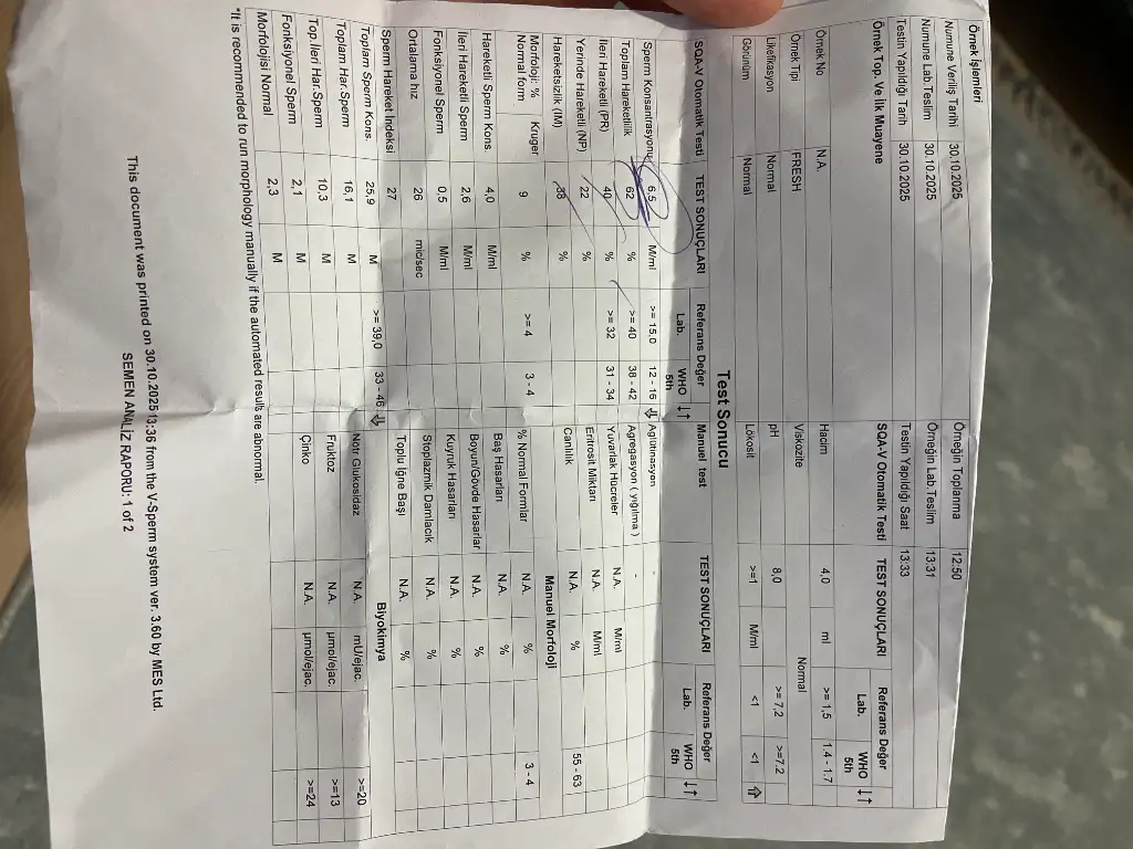 Ml’de 6 milyon sperm var ama total 26 milyon sperm var. Sayı düşük evet ama Morfoloji 9 hareketlilik çok iyi. Az ama kaliteli sperm demek bu. Takviyelerle halledilebilir bir durum benceBunla hamile kalınırmı dogal yolla