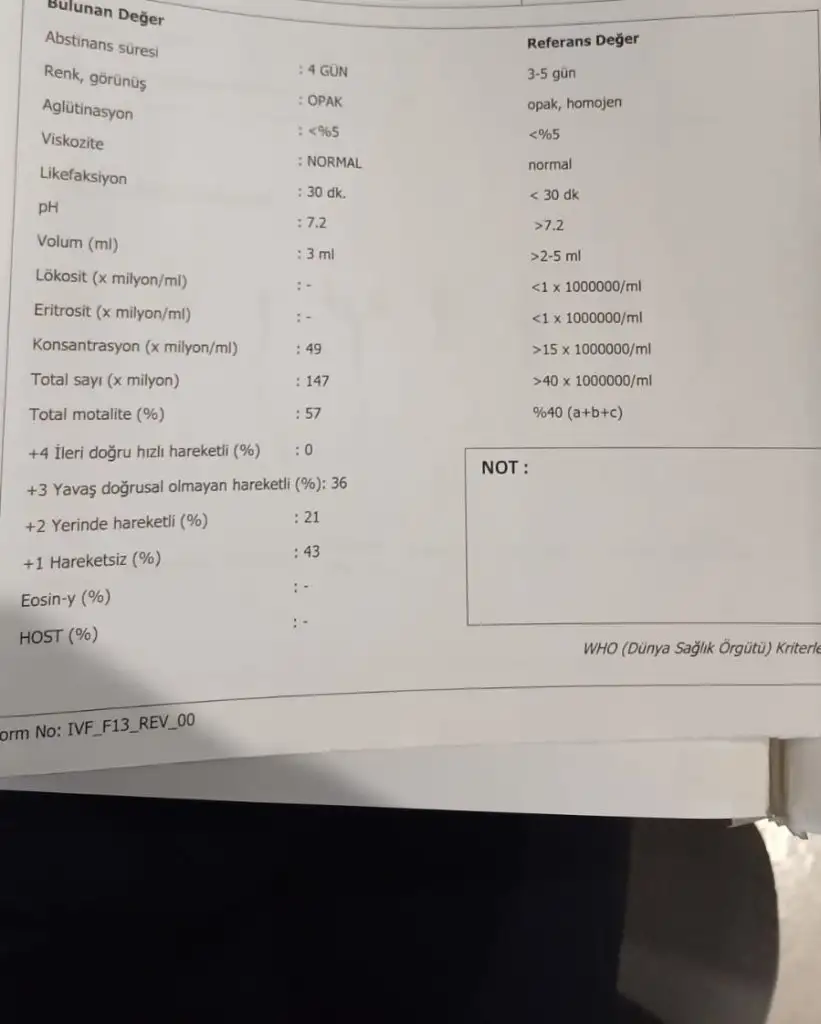 Tam net bilgim olmamakla beraber . Düşük sebeplerini araştırılması gerekirdi diye düşünüyorum. Morfoloji düşük geldi biraz normal sperm miktarı azaldıkça sağlıklı embriyo elde edilme şansı da az oluyor. Keşke yenilenmiş olsaydı test. 4 ayda bile ne kadar çok farklılık olabiliyor . Ayrıca ileri hareketlilik 0 görünüyor hareketli sperm sayısı önemli gebelikte . Umarım Rabbim gönlümüze göre verir.Merhaba! Bu eşimin 3 yıl önceki sonucu ve doktorum yeni düşük olduğunu söylüyor daha yenilenmedik eskisine bakarak eşime takviye ilaç yazdı.3 ngsli denememiz oldu tutmadı.sonra kendiliğinden hamilelik oldu kalp atışı durdu.her seferinde kendiliğinden gebe kalınca kalp atışı duruyor.ve benimde yaş 33 3 sene önce ultrasonda yumurtalarım çokken şimdi azalmış dün prp ve eksozom oldum.acaba eşimin spermi düşükse ondan mı gebelik kaybım oluyor.3sen önce sperm sayısı 45milyon hareketlilik yüzde 60 mış yumurta toplama işleminde aldıkları sperm sonucu buydu şimdi resim ekliyorum Buda toplama işlemi olmadan önceki
