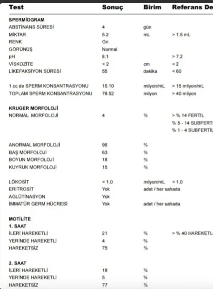 Evet verdik canım sayı çok artmamış 20 milyon civar total . İleri Hareketli %65 olmuş morfoloji %47 ama bu seferde eşimin fsh 0.3 olmuş testosteron baya düşmüş şuan sayıyı düşünecek durumumuz kalmadı fsh düşmüşCNim test verebildinizmi topik biraz durulmuş