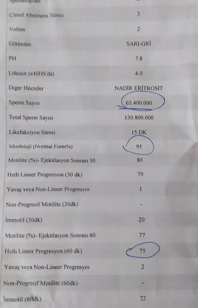 Merhaba kızlar, eşimle 6 aydır çocuk deniyoruz henüz olumlu bir sonuç elde edemedik. Ben doktora gittim herhangi bir sorun çıkmadı. Eşimin spermiyogram sonucunu ekledim. Doktor şekil bozukluğu olduğunu ve ileri harekette biraz düşüklük olduğunu söyledi. Eşinde bu değerler olup hamile kalan var mı ? Yada bu değerler gebelik için gerçekten yetersiz mi ? Bilgisi olanlar varsa bilgilendirirse sevinirim. Simdiden teşekkür ederim 😊