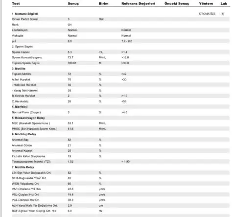 Sperm sayısı ml’de 74 milyon, toplamda 390 milyon. Hareketlilik %72 ( %70 ileri hareket , %2 yerinde hareket ). Morfoloji %3 . 9 ay önceki sonuçlarda ise sperm sayısı ml’de 60 milyon, toplamda 330 milyon , hareketlilik %58 ( %53 ileri , %5 yerinde hareketli) Morfoloji ise %5 diMerhaba bizde 4 defa yaptırdık ama aşırı bulanık resimler iyi okuyamadım ileri hareket en az 50 olması gerekiyor sperm sayısı da 39 mil. Felan olması gerekiyor Ph. Değeri 7-8 şekil bozukluğu morfoloji en fazla 4-5 gibi sayılar iyi takviye ve sağlıklı beslenme kilo vermeyle bu değerler normale dönüyor aslında fındık fıstık ceviz pekmez muz bunlar iyi geliyor özellikle pekmez toparladı takviye