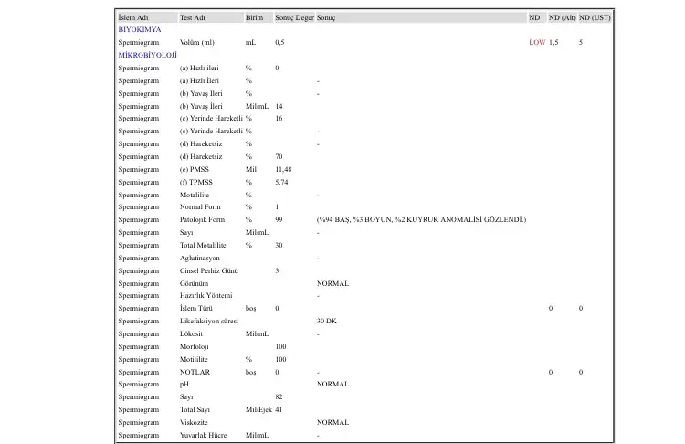 Merhaba 2 senedir çocuk istiyoruz tedavi gördüm ama ilk kez Eşime bakıldı. Erkek faktörüyle ilgili hiç bilgim yok. Anlayanlar yorumlayabilir mi ? Bir de test kabının içine tam gitmedi normalinden çok çok az gitti dedi eşim ilk kez olunca gerilmiş baya. Acaba testi tekrarlamalı mıyız?