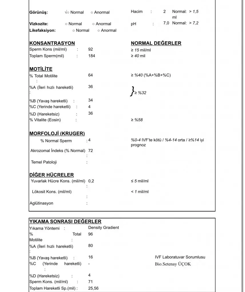 7 aydır deneme doktorlar sorun yok diyor ama artık olmadıkça kendimi bırakıp acaba spermlerde mi sorun var diye kurmaya başladım bunlar da eşimin değerleri