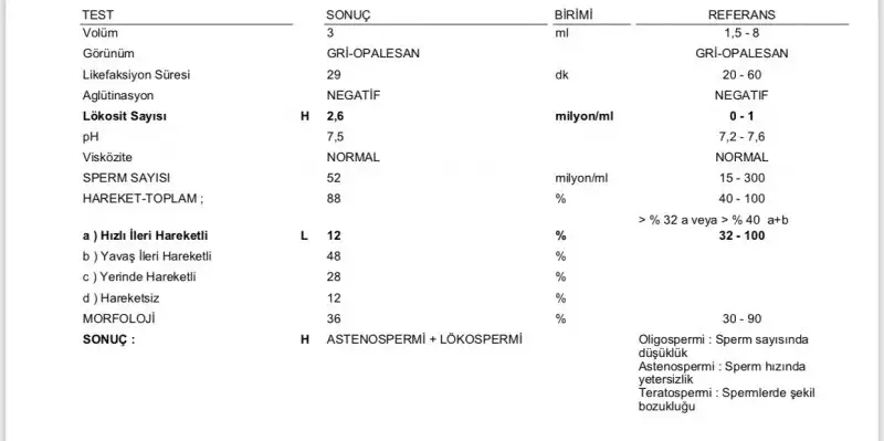 arkadaşlar merhaba, eşimin sperm testleri yapılan tarihleri itibariyle iyiye gitmekte ama morfoloji sorunu aynı devam , onun haricinde kafamızı karıştıran Lökosit , eşimin ilk testinde %7 gibi yüksek bir rakam çıkmıştı ve bellide denemelerin hüsranı ona bağlıydı çünkü ileri hız 0 dı. Sonra ilaç kullandı lokosit gitti hız iyi derecelere çıktı , morfoloji yine aynı devam , akabinde tekrar test yaptırdık ama yine lokosit sıkıntımız çıktı , bu konuda sayı hız tarafında sıkıntımız olmaması iyi ama lokosit yüzünden belki morfoloji sıkıntısı da çocuğu engelliyor oldu, bu konuda tecrübeli bilgili başına gelen birileri var mı acaba ? , en yakın zamanda iyi bir üroloğa gideceğiz sıkıntı ne bakalım çözmek istiyoruz ,