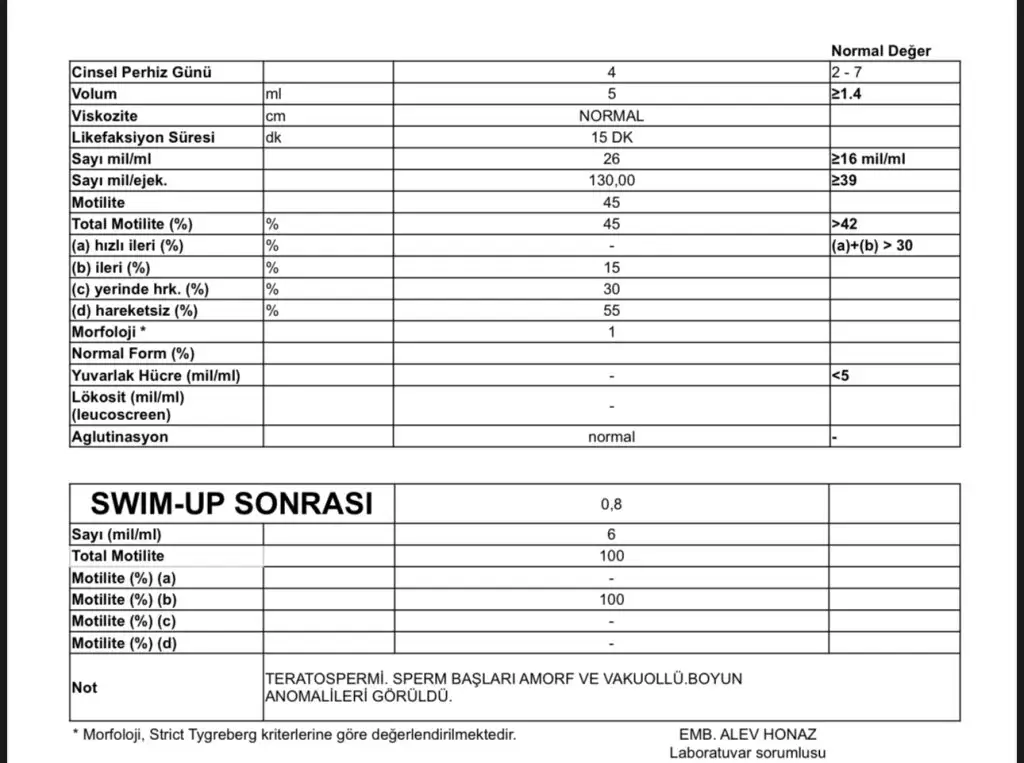 Bir de yıkama sonrası da motilite a da 0 sanırım yani yıkama sonrası da hızlı sperm yok sanırım.