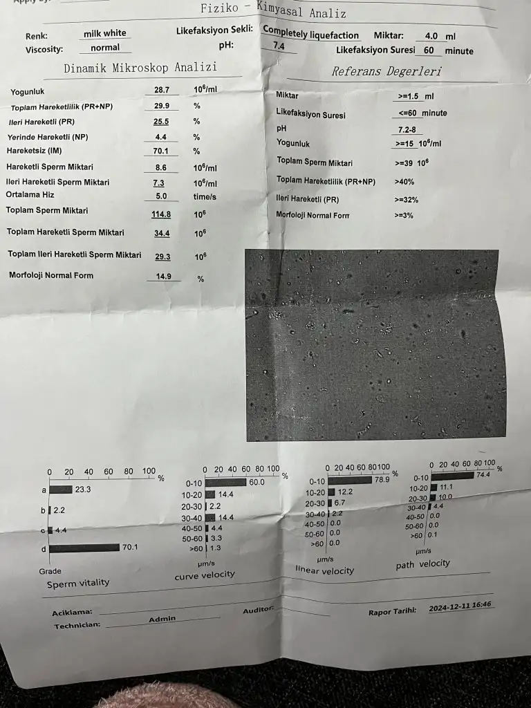 Arkadaşlar merhaba. Bugün bana rahim filmi çekildi eşimden spermiyogram alındı. Bende bir sorun yok tüpler açık rahim şekli düzgün dedi hormonlar da iyi. Eşim için de sadece toplam hareket 40 civarında olmasını bekleriz sende yüzde 30. Sigara kullanımının etkisi olabilir azalt bırakmazsan da dedi ve bir ilaç verdi ama sonuçları çok yorumlamadı biz de anlayamadık yorum yapar mısınız?
