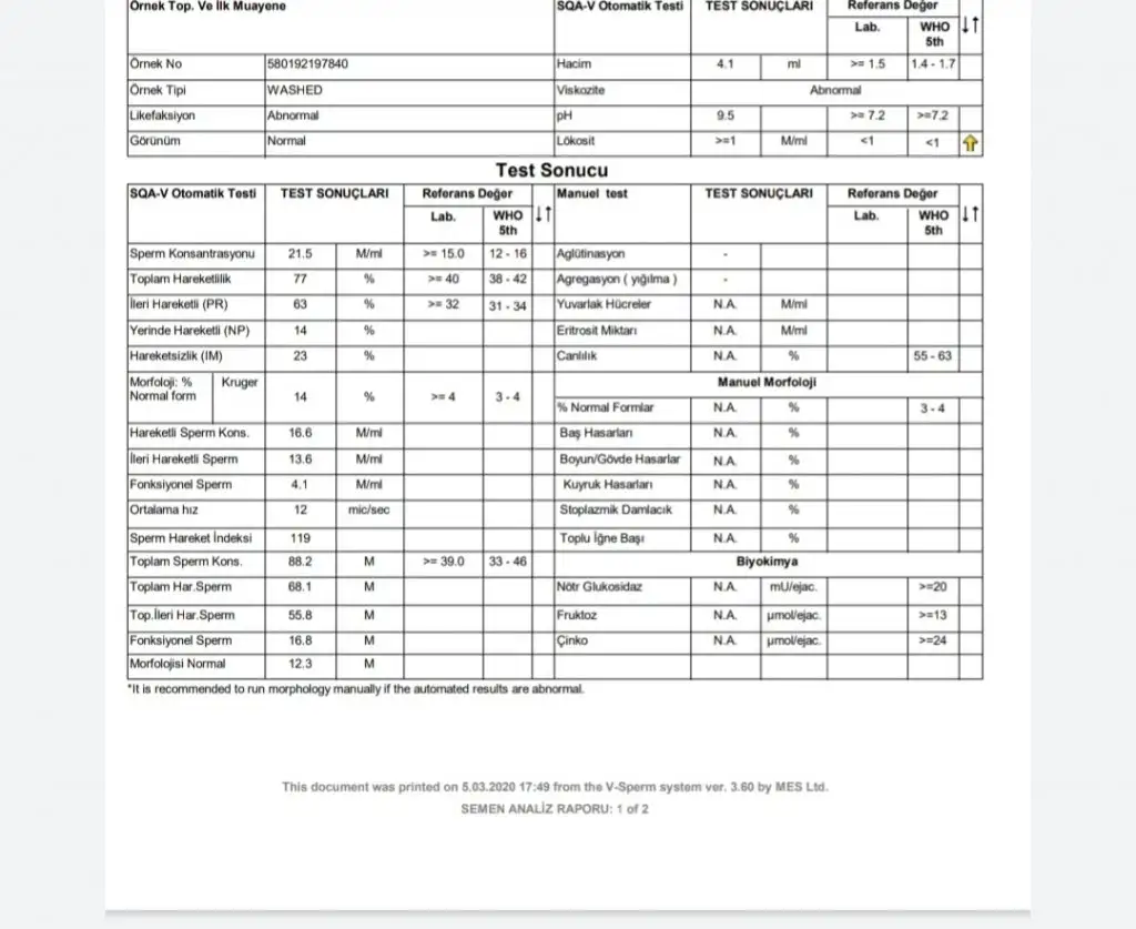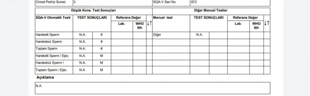 Eşime sperm testi yaptırdık ve sonuçtan hiçbir şey anlamadık. Kadın doğum doktoruma sordum, yıkama sonrası sperm yok varikosel olabilir. 3 hafta sonra başka bir yerde tekrar test yaptırın dedi. Daha önce ürologa gitmiştik muayene de varikosel yok demişti doktor. Devlet hastanesi olduğu için sperm testini ileri tarihe verdi. Bizde dayanamadık başka yerde yaptırdık. Sonuçlardan anlarsanız size sorsam olur mu?