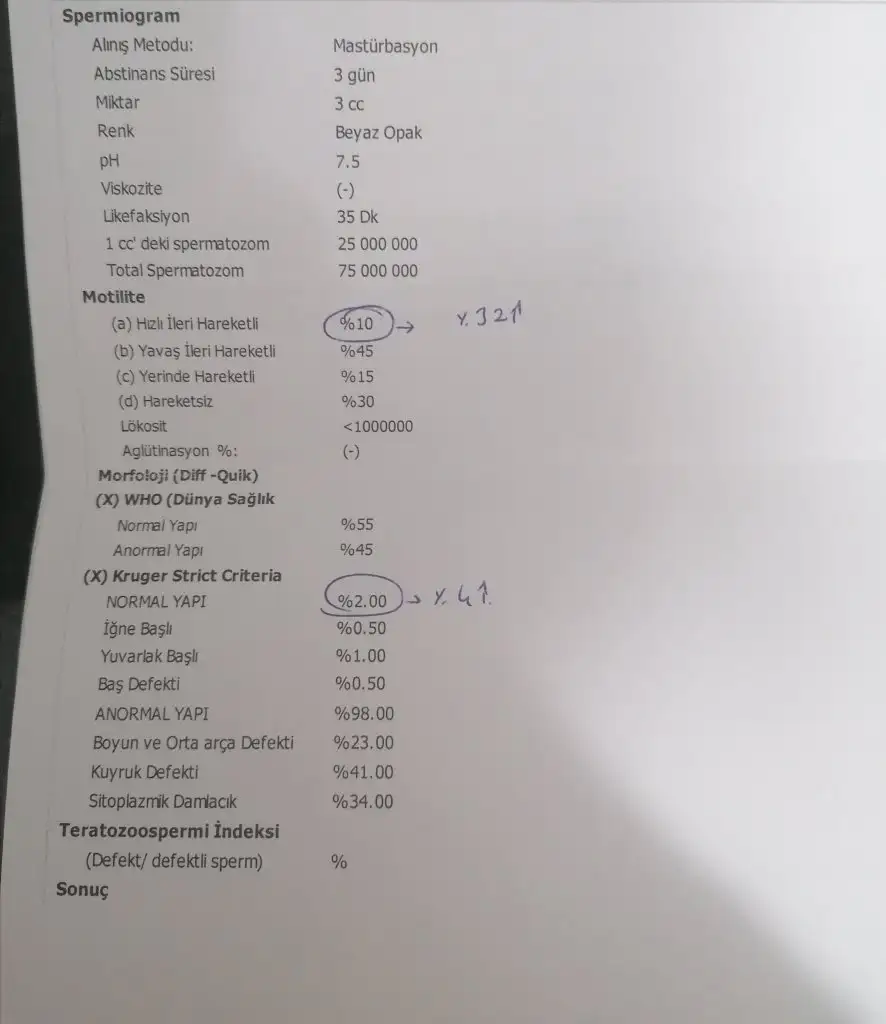 Esim eve geldi, hic sperm yok demis. O ne oluyorsa artik ilk defa duydumGenelde ileri hareketlilik ve morfolojisi dikkate alınıyormuş. Bizim o iki değerde 0 çıkmış. Eşimin canı baya sıkkın. Allahtan ümit kesilmez. Tedavisi ilacı var diyorlar da doktorun önermesini bekliyoruz. Benim moralim biraz yerlerde eşime caktirmamaya çalışıyorum ama iki yıl deneyip olmayınca bir de sonuç böyle ister istemez buruldum. Ayrıca doktorun tepkisi hiç hoş değil sonucu mail olarak isteyip başka bir üroloji doktoruna gösterin bence.