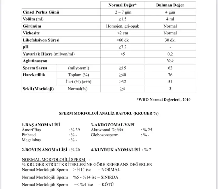 Çok teşekkür ederim ph değeri alanı boş biz ona takıldık daha doktora da gösteremedik o yüzden buraya attım sonucuPek anlamam ama sayıda hareketlilikte bir sıkıntı yok gibi..morfoloji bir puan düşük oda çok önemli degil bence..benim esimde hem sayı düşüktü hem morfoloji çok düşüktü suan iki çocuğum var tedavisiz sizinde önemli bisey olduğunu sanmıyorum..yani bizim değerlere göre baya iyi