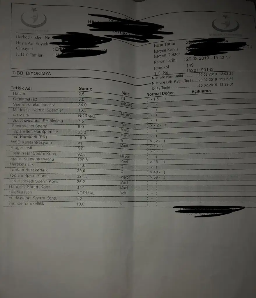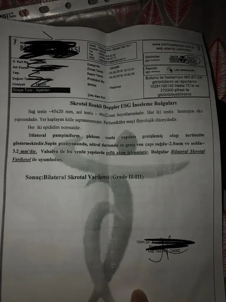 Sonuçlar kötü değil anladığım kadarıyla. Şöyle söyliyeyim, varikosel bir tür varis testislerde kirli kan birikimi oluyormuş bu da ısıyı yükselterek spermleri öldürüyormuş.