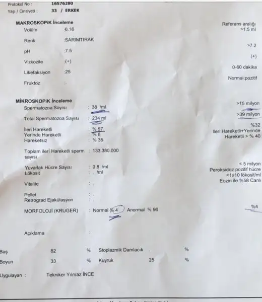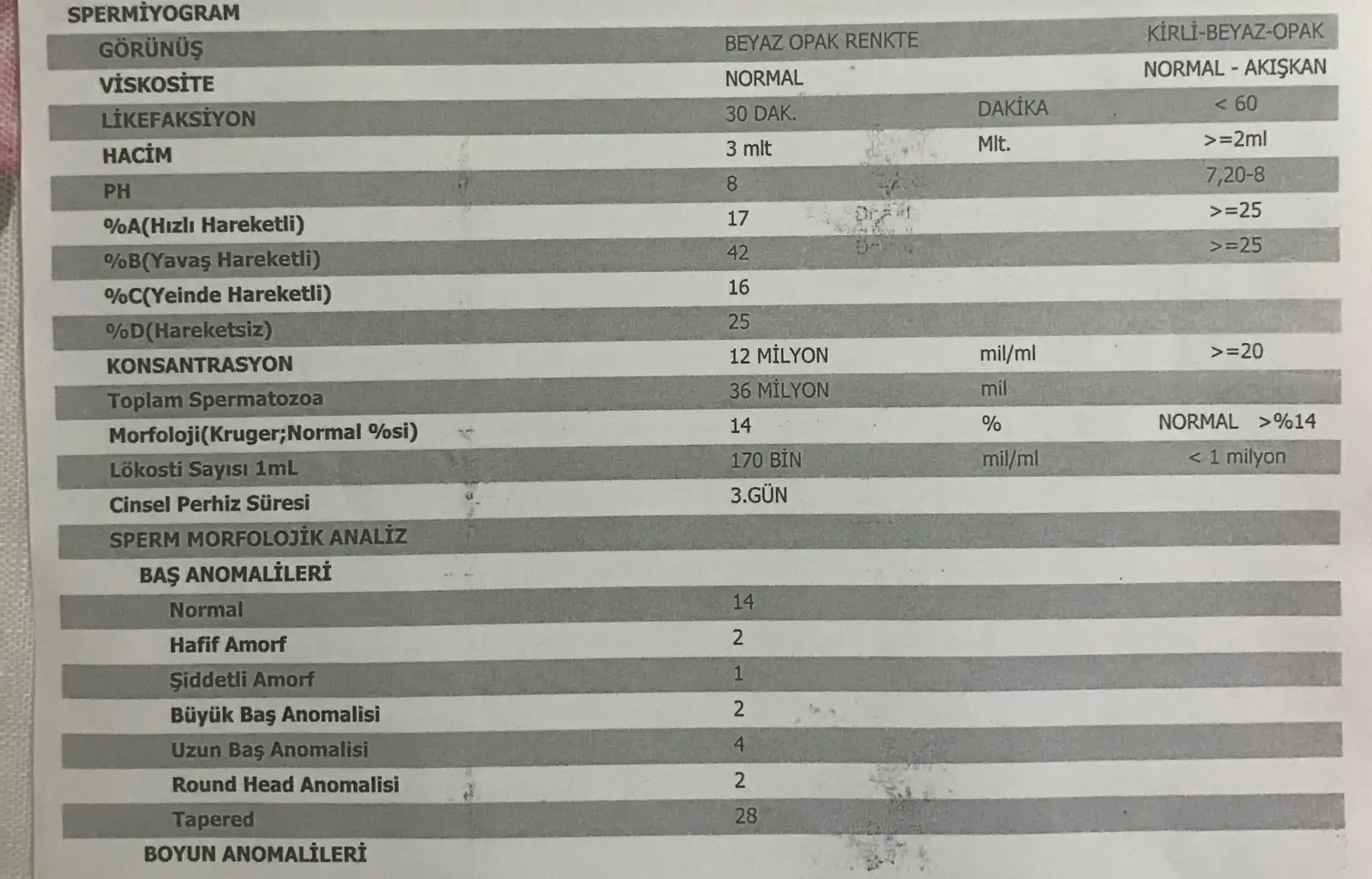 Yine de bildiklerimi paylaşayım. Icim rahat etmedi .Morfoloji yapi demek.Tum spermin yapısi bozuk .Yapi hemen değişen bir sey degil .Kruger e gore 4 ve üzeri morfoloji normal kabul ediliyor .3 de iyi sayiliyor .