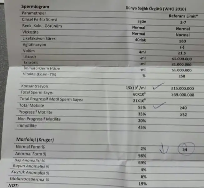 Değerler kötü malesef. Hem sayıda hem hızda hem morfolojide ciddi bozulma var. Aşılamayla bile uğraşma bence. En azından tüp bebekte tutma olasılığı aynı oluyor normal değerlerde ki biriyle. Vakit kaybetme bence başka şeylerle.