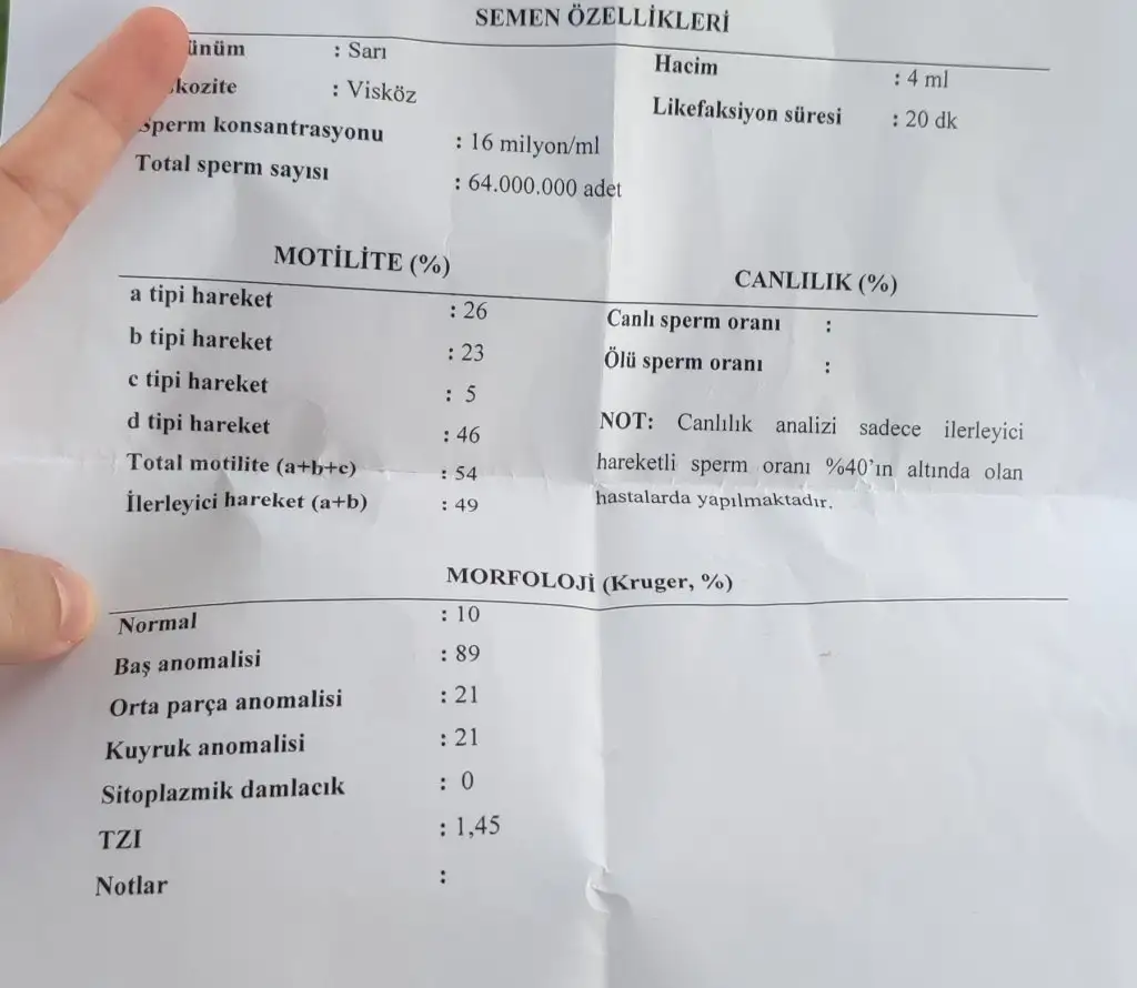 Mikroskop 5-6 yuvarlak hücre motilite %25 sayı 40milyon /mm3 miktar 5ml renk krem ph alkali kıvam hafif yoğun sizce nasıl sonuçları