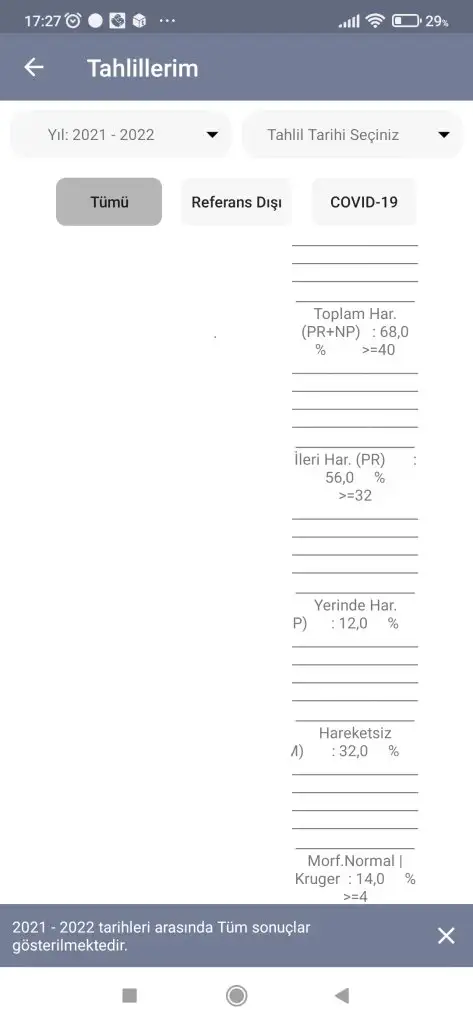 Mikroskop 5-6 yuvarlak hücre motilite %25 sayı 40milyon /mm3 miktar 5ml renk krem ph alkali kıvam hafif yoğun sizce nasıl sonuçları