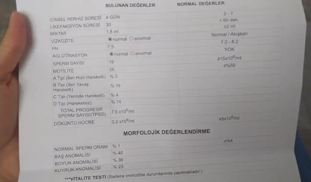 evet hareketli sperm sayısı düşük artı morfoloji de 1 düşük bizimki de buna benzer