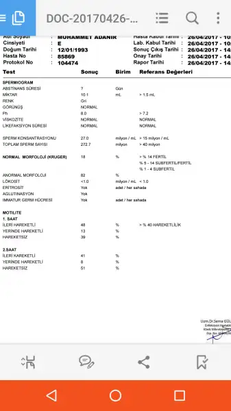 Canım gösterdik ama normal bi poliklinikti gittiğimiz. Oda bizi Üniversite hastanesine yönlerdirdi infertilite merkezine eşim yarın gidecekCanım ben pek anlayamadım biraz farklı bir test olmuş kavramların isimleri açısından ama benim anladığım kadarıyla morfoloji %1 yani normal sperm sayısı çok az bozuk sperm sayısı çok fazla bu bile tek başına hamilelik için büyük engel hızlı ileri sperm var ama yüzdesi düşük ve toplam sperm sayısını tam okuyamadım ama 9 milyon gibi birşeyse o da az geldi ama inşallah daha fazladır. sen sonucu gösterince beni haberdar et ama :)