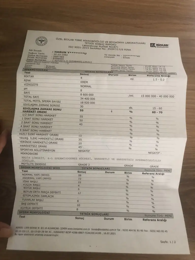 Arkadaşlar eşim Ocak ayında varikosel ameliyatı oldu çift taraflı sperm sayısı 6 milyondu Buda yeni yaptığı test ileri hareketlilik morfoloji nasıl anlayan yazabilir mi ?