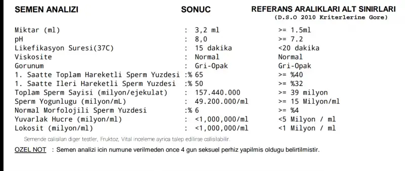 Kizlar 2bucuk yıldır cocuk icin ugrasiyoruz. Esimin sperm sonuclari bu şekilde.