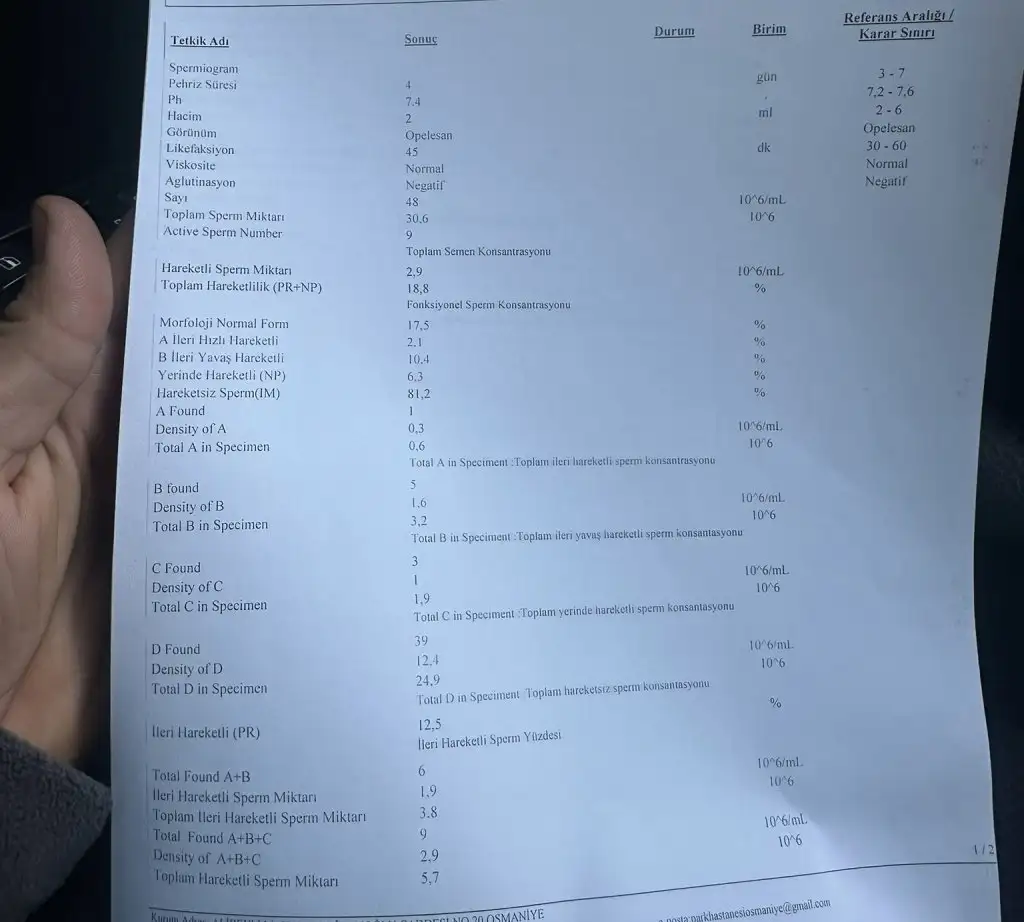 Morfoloji sizinde düşük ama çok değil 4 olması istenir genelde sizinki 3. Hızlı ileri hareketli sperm sayısı düşük %32 olması kabul edilirken sizinki %3 çıkmış.Benimkini de yorumlayabilir misiniz rica etsem