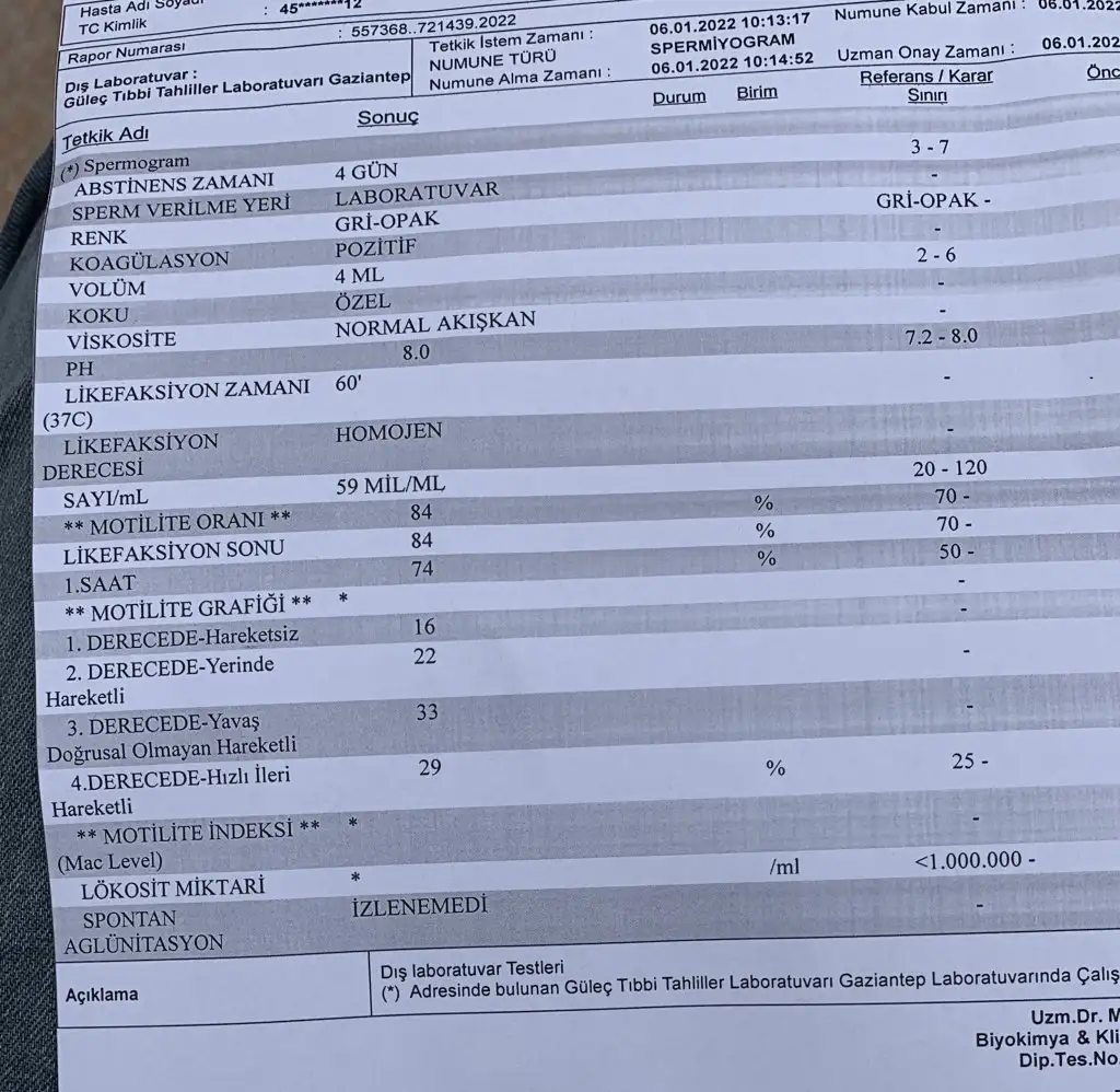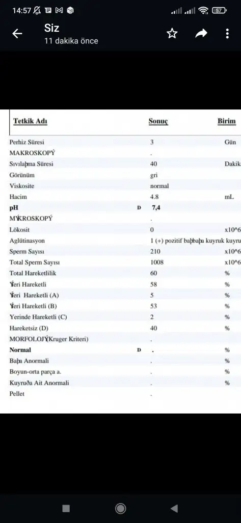 Sayı ve hareket iyi. Fakat morfoloji çıkmamış yani muhtemelen 0. Yani şekil bozukluğu olduğu için döllenme olmuyor genelde. Takviye kullanın en az 3 ay.Kızlar bana da yardımcı olur musunuz