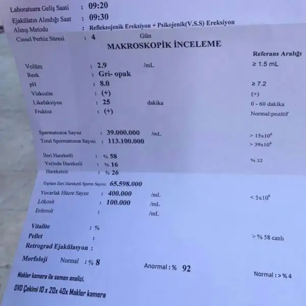 1 ml'de Sperm Sayısı :28.200.000 /ml 20-250 milyon