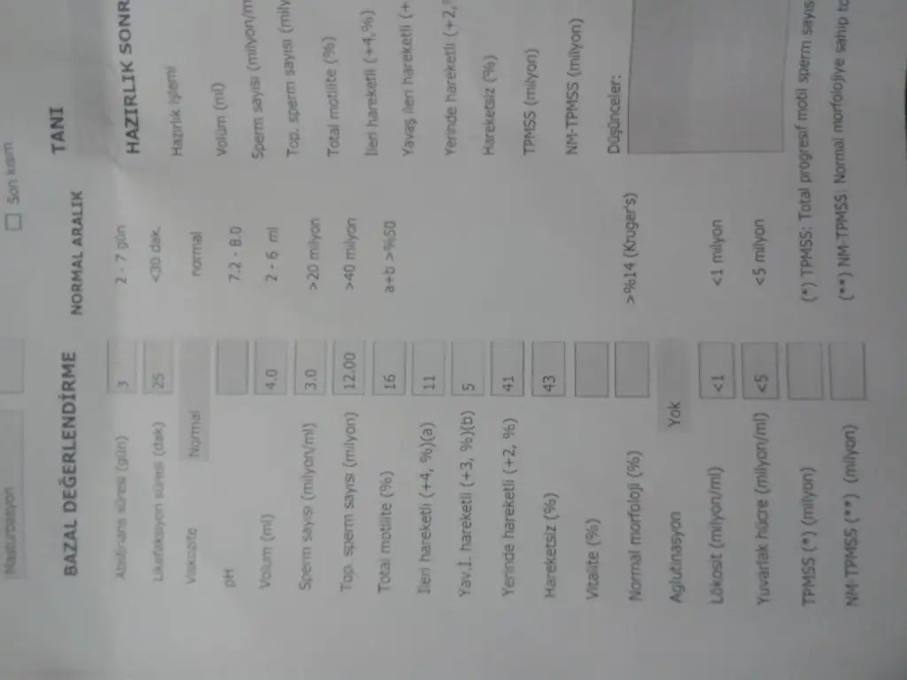 Herkese merhaba bizde test yaptirdik normalde ben pko hastasym klomen kullandm ilcm dun bitti bugunde esimin testini doktora gosterdim ve asilama yapmamz gerek esinin spermleri hareketss varikosl olablr dedi. Degerleri paylasmak istedm yardimci olursaniz cok sevinirim