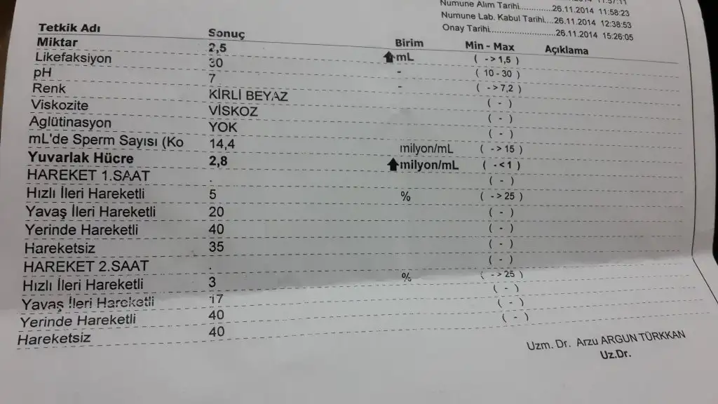 Yalnız biraz enfeksiyon var sanırım, bu da likefaksiyon süresinin artmasına neden oluyor. Sanırım bu sürenin 30 dakikanın altında olması gerekiyor, sizde tam sınırda. Gebe kalmaya engel olur mu bilmiyorum tam sınırda olması.