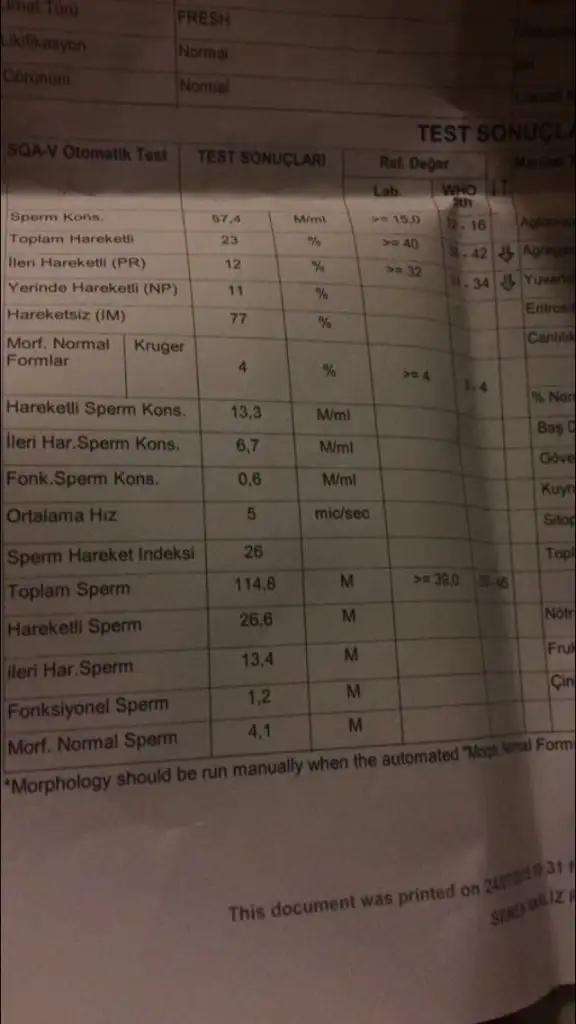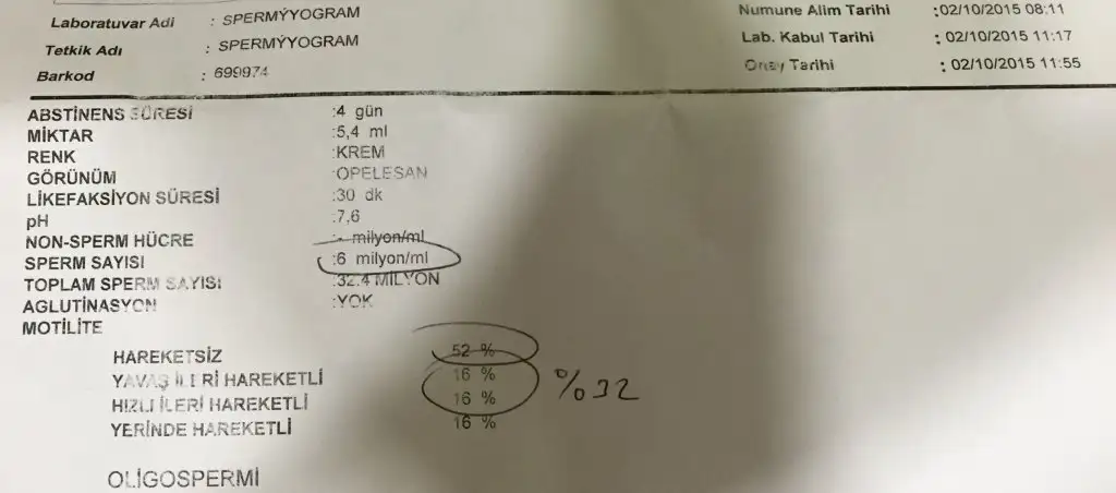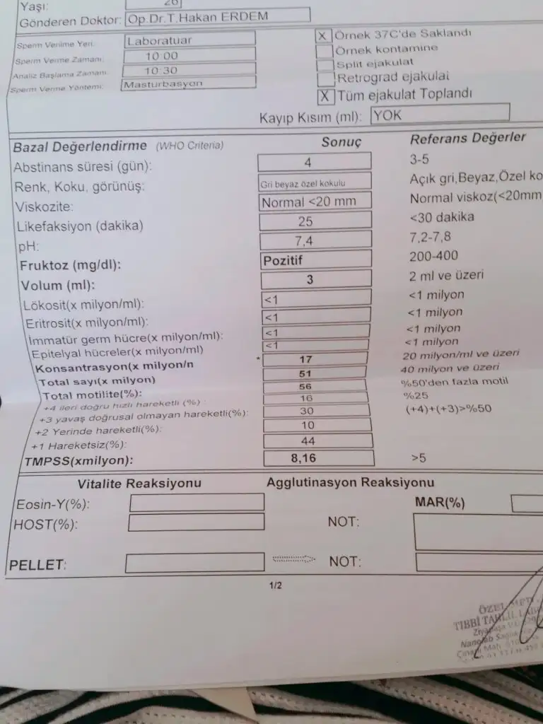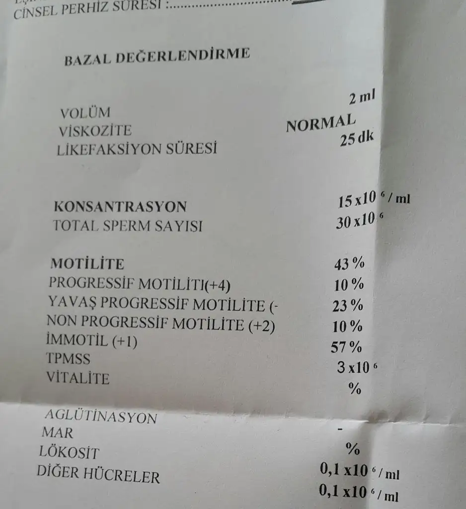 Hayır canım değerleri çok kötü değil gayet iyi hatta. Morfoloji ve hız biraz bozuk. O da sınırda. Yani berbat değil. Sigara içiyorsa bıraksın keçi boynuzu özütü veya kürü ile bikaç ayda düzelir inş. Sayı gayet iyi maşallahEki Görüntüle 1647030 Kızlar test okumayı bilenler lütfen beni de bilgilendirebilir mi acaba?