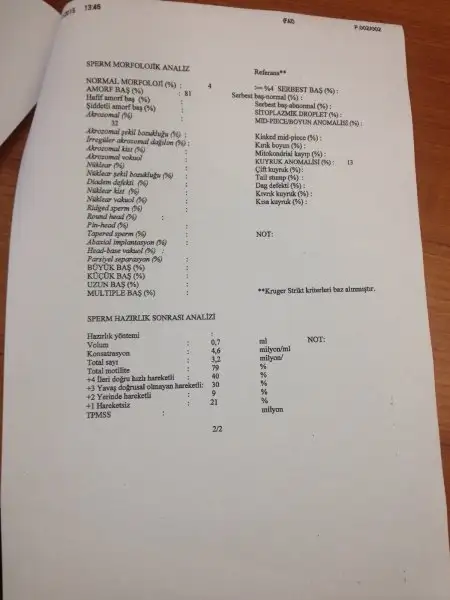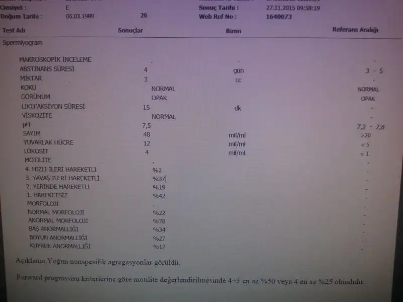 Kizlar merhaba, esimin sperm testi sonuclarini yorumlarmisiniz, sizce nasil durum ? 3 ay proxeed plus kullanmistik ileri hareket 0 di suan yuzde 8 olmus.. Morfolojimizde 1 di 4 olmus ama sayimiz 16 milyonken 11 milyona dusmus :( bu durumda dogal yolla hamilelik olabilir mi ki ?