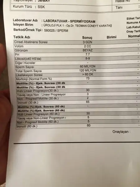 Merhaba canım. Sperm sayınız malesef düşük muhtemelen varikosel yüzünden. İleri hızın da artması lazım. Onun dışında morfoloji iyi. İyi bir ürolog bulun ameliyata öyle karar verin canım. Çünkü ameliyattan sonra 3 ay Sperm sayısı gerekli artışı ancak gösteriyor.merhabalar 3 senedir evliyim 1.5 senedir cocuk istiyoruz ama henuz olmadı doktora gıttık benden bir duzune test hsg ıstendı,eşime de doktoru elle muanesınde hafif mıktarda varikosel olabilirsin dedi emin olmamakla birlikte. eşimdende spermiogram hormon testi ve film istedi eşimin ilk etapta yaptırdıgı spermiogram test sonucu :