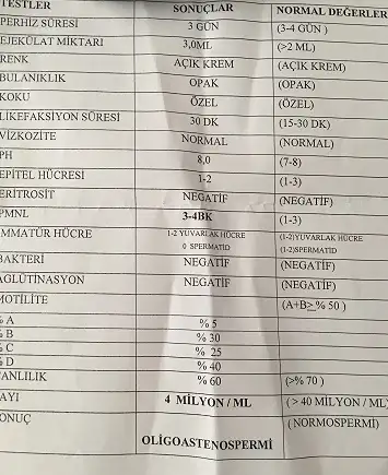 Teşekkür ederim. Sınav sonucu bekler gibi heyecanla bekledik sonuçları. Çok tuhaf bir duyguymuş. Çok şükür görünürde bir sorun yok. Bende de bir sıkıntı gözükmüyor. Demek ki zamanı var. :)Hiç bir sorun görünmüyor. Morfoloji alt sınırı %4 genel olarak kabul edilen. Sizin testi yaptırdığınız yer normal alt sınırı yüksek kabul etmiş.
