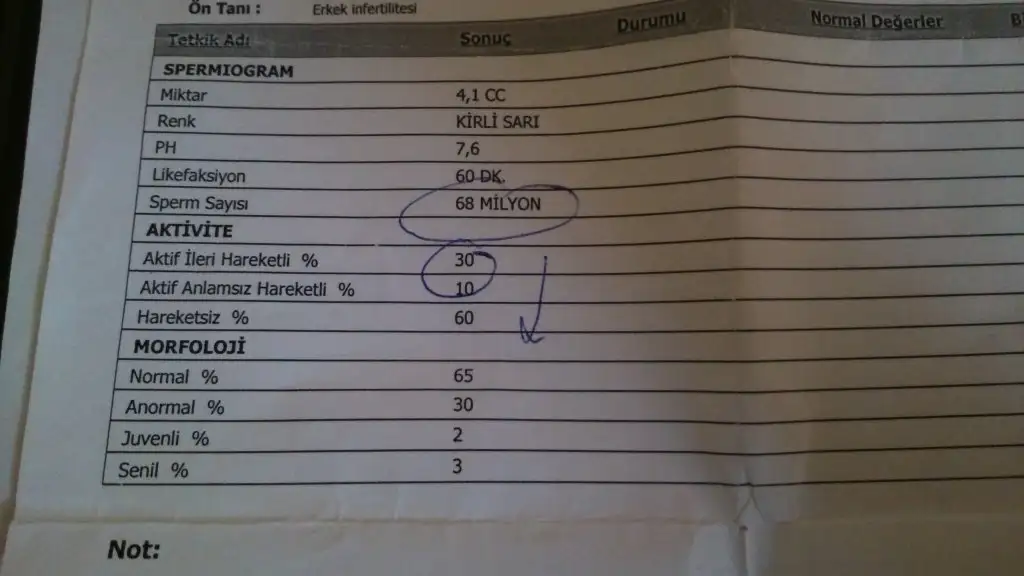 Volüm: 2 ml (≥1.5 ml) Görünüm: NORMAL Likefaksiyon Süresi: 15' Konsantrasyon: 19,5 x10⁶/ml (≥15x10⁶/ml ) Total Sperm Sayısı: 39 x10⁶ Motilite: % 28 (≥%40) Progressif Motilite (+4): % 8 Yavaş Progressif Motilite (+3): % 10 Non progressif Motilite (+2): % 10 İmmotil(+1): % 72 TPMSS: 7 x10⁶ Normal Morfoloji: ** % Vitalite(HOS /EOSİN-Y): % Aglütinasyon: YOK Lökosit: YOK Diğer Hücreler: 2 x10⁶