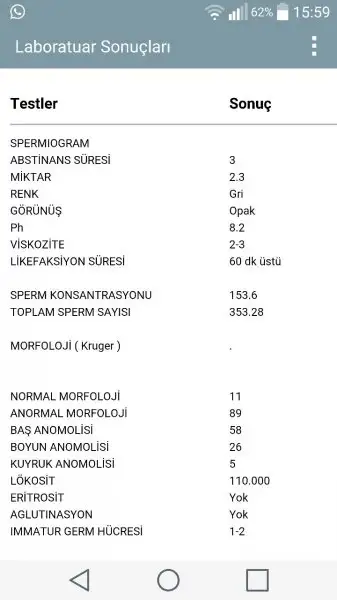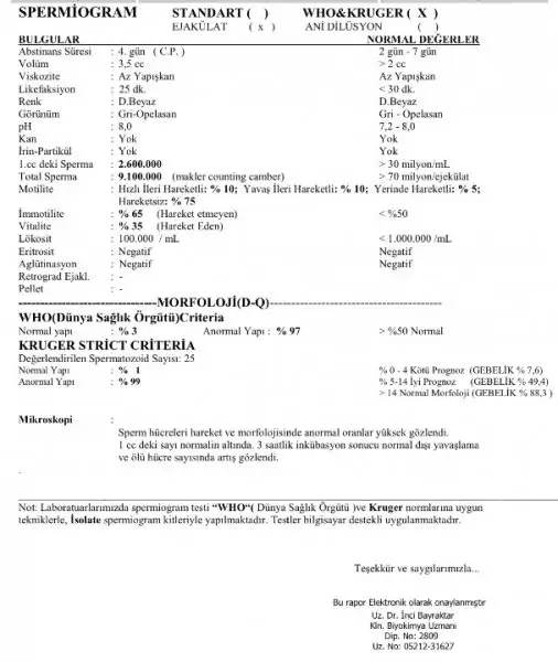 Anladım canım.. Kruger daha güvenilir diye duydum ondan yaptırdım kuzum..yok canım ben de araştırma yapıyorum hala gene sperm testi vereceğiz bakalım ne çıkacak