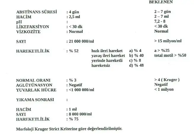 Bilmiyorum sadece bu test yapıldı. Gebe kalmak imkansız mı bu sayılarla pekiSayınız düşük malesef. Hareketsiz Sperm fazla. Morfoloji bakılmadı mı?