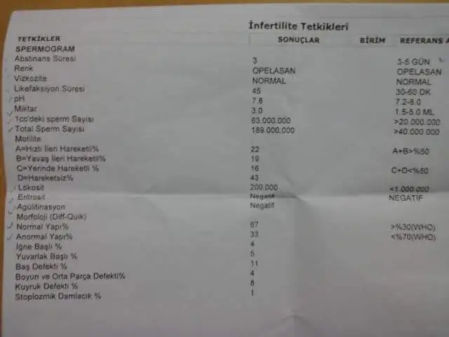 Eşim ve ben yaklaşık bir yıldır çocuk sahibi olmayı deniyoruz. Benim yaşım 24 eşimin ise 26. Eşim bugün sperm testi yaptırdı. Eğer testi yorumlarsaniz çok memnun oluruz. Hepinize simdiden tesekkurler.