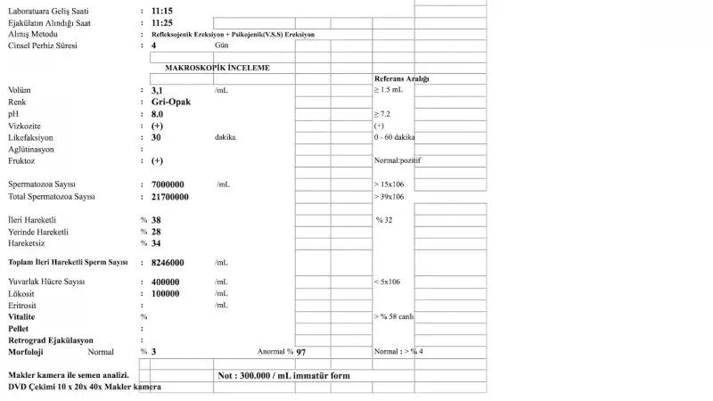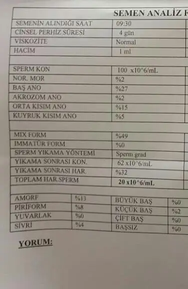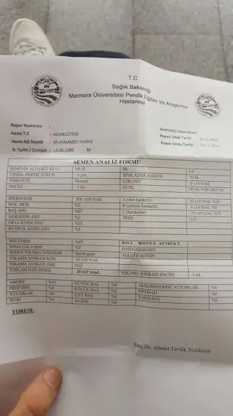Canım fotoğraftaki değerleri okuyamadım net değil daha yakından çekip gönderir misin. Ayrıca eşinin adı soyadı tc sine kadar var yönetimle konuş fotoğrafı sildir.Fatma hanım benim eşimin sperm testine de bakabilir misiniz acaba rica etsem