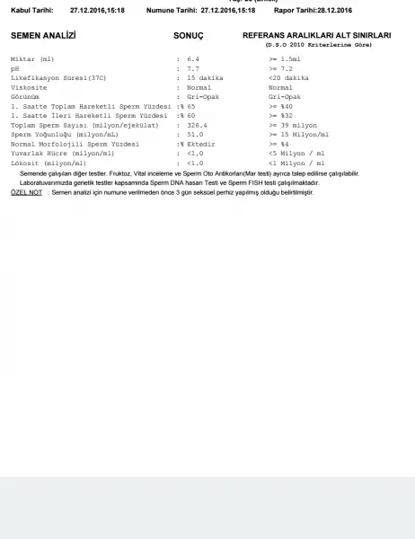 Cannim eğer sende bir sikinti yoksa normal değerleri esin için sadece ileri hareketlilikte azlik söz konusu bunu da keçi boynuzu kuruyle cogaltabikirsneşimin sperm sonucu yardımcı olursanız sevinirim sayı 40 milyon total sayı 120 milyon ileri hızlı hareket%15 ileri yavaş hareket:%30 yerinde hareketli:%40 hareketsiz%15 normal %70 anormal %30 1.5 yıldır evliyim hamile kalamıyorum