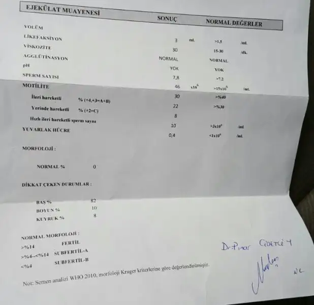 Canim sayida morfoloji de normal senin esinin değerlerine yakin çoğu kişi normal yöntemle hamis kaldi sen de bor sorun var mi pemi ?birde volüm sizde 6.4 genelde 6 dan az olmaso gerekio gibi ondan emin olamadimMerhaba eşimin testini de yorumlar misiniz