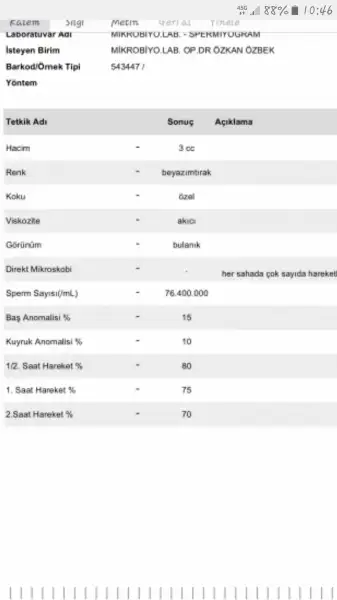 ama morfoloji aynı idi. o zaman bir üroloji doktoruna göstermemiştik benim kadın doğumcum da sorun yok sana klomen tedavisine başlayalım demişti. klomen cevap vermeyince tekar yaptırdık ve böyle çıktı. üroloji doktoruna gösterdik ama normal sıkıntı yok diyor. sayı normal olunca morfolojiyi önemsemiyoruz dedi. eşim bi ilaç filan yokmu vereceğiniz dedi doktor da yok dedi. eşim peki neden olmuyor 1,5 yıldır ne yapabiliriz dedi o da aşılama kağıdı yazayım size dedi yazdı ve verdi. sanırım özel de bir doktora daha göstermek mantıklı olacak ilk aşamada. yoksa zaman mı kaybediyoruz gidip devletteki aşılamayı yaptırıversek mi bilmiyorum