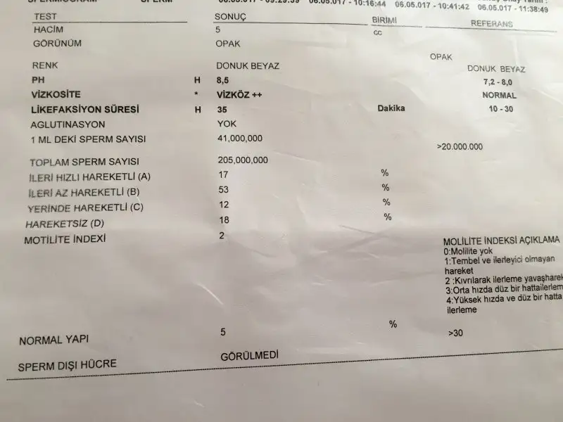 Morfolojiniz %8 gozukuyr normal diye yazan deger morfoloji. Bu oran yeterli morfolojide sorun gozukmuyor ama ileri hizli %5 galiba o az onun artmasi gerekebilir. Havuc suyu fln hizi arttityor diyorlar belki destek vitamin de onerebilirler. Bnm anladjklarim bunlar:)SonuçlarımizEki Görüntüle 1992139