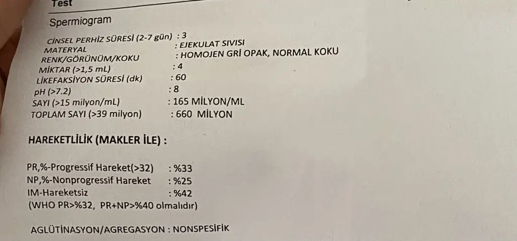 Spermiogram testi normal denilen arkadaşlar nolur dönüş yapın kafam çok karışık 2 üroloji normal dedi kadın doğum foktorum ileri hız lı yok dedi ne yapıcam 2 yıldır olmuyo. Başından geçen ek bişey kullanan varsa nolur yazsın iyice psikolojim bozuldu benim yumurtam bu ay görüldü geç yumurtluyormuşum bu ayda adet olursam rahim filmi bakılcak hormon testleri falan ama 9 ay önce ameliyat oldum rahim ağzı alındı tıkanıklık olsdoktor bunu görmezmiydi