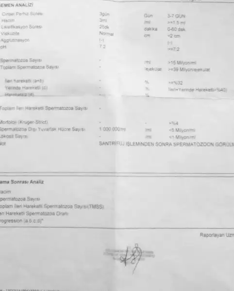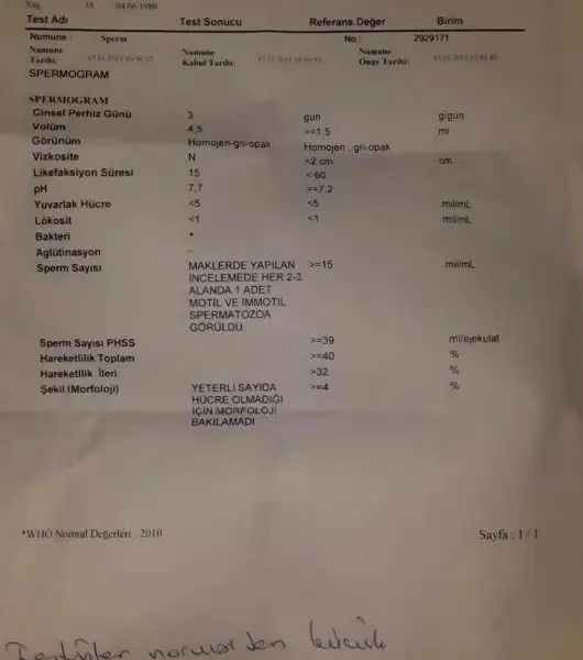 Can'ım tahlil sonuçlarından anlıyorsan banada yardımcı olurmusun ?Bak bize düşen ne biliyor musun eşine 15 gün keçi boynuzu kürü uygula Allah im günah yazmasin biraz ayrıntıya gircem birlikte olduktan sonra sen kalkma esin giyindikten sonra senin ayaklarını tutup yukarı kaldırıp silkelesin seni böylelikle spermler yavaş olanlar bile yerinde duranlar bile yumurtaya ulaşır hiç canını sıkma