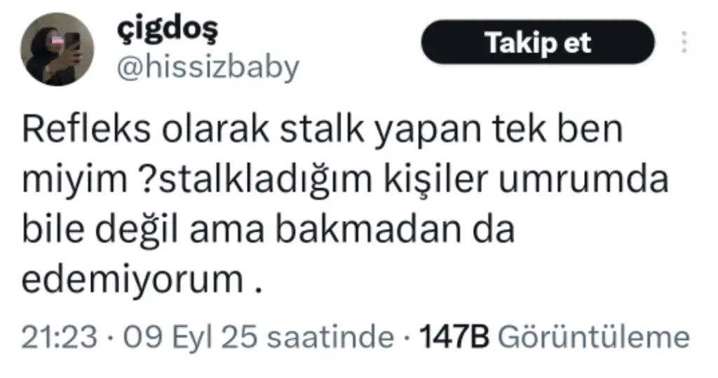 Sizin profil herkese açık mi? Sizi stalklamak isterdimKimseyi merak etmiyorum maalesef çok nadir biri aklıma gelecekte bakacamda öyle bi vaktim yok