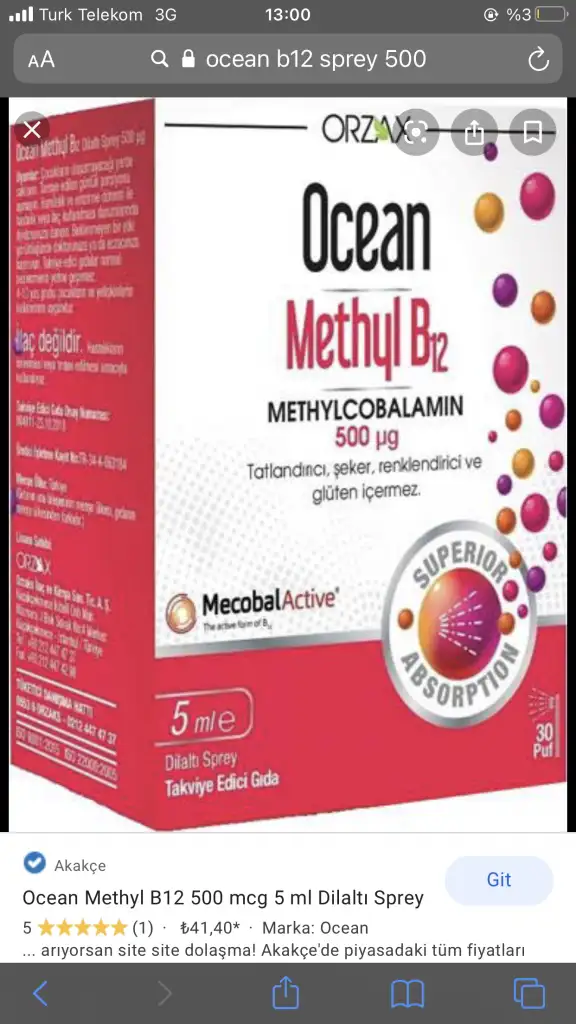 Evet zeryam b12 de alt seviyesi 134 üst 590 bizimki 320 doktor takviye yapalım dedi ocean plus 500 lük haftada 3 kez . Birde sidefer kullanıyorduk onu değiştirdi .tuce_tuce sevindim canım bak en azından vitamin eksikliği çıkmamış genel muayenesi de güzel çıkmış çok şükür