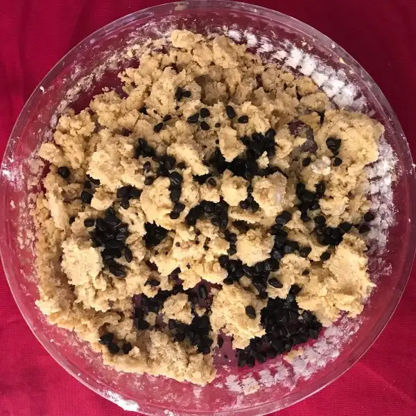 Sıra unumuzu eklemede. 2.5 bardak unu bir anda değil yavaş yavaş ekleyelim ve fotoğraftaki gibi kırpık kırpık halde iken çikolata parçalarını ekleyelim.