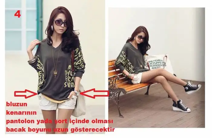 İster pantolon ister şort giy, bluzunun önünü yada kenarlarını pantolonun içine tuttur. resimlerde kırmızıyla işaretledim. Bacak boyunu uzun gösterecektir bu ufak tiyo.